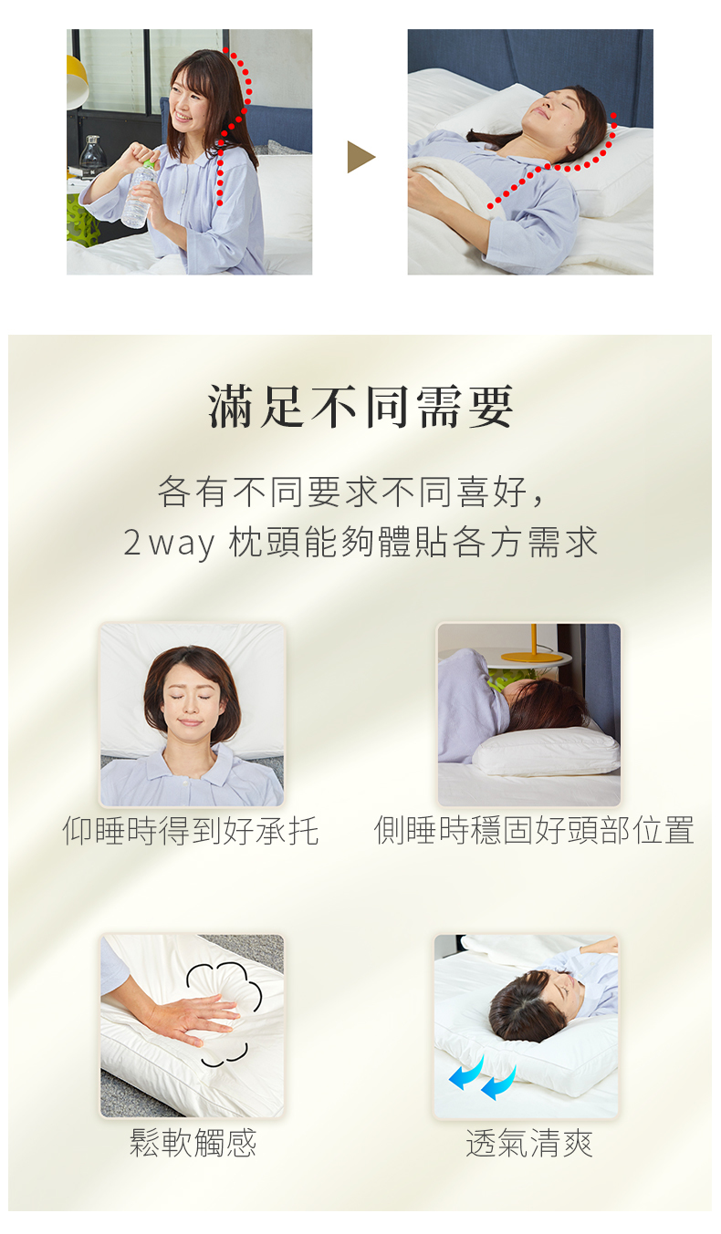 上下面分別素材造出軟硬面,隨個人喜好調換。兩面不同觸感,兩種睡眠感受。