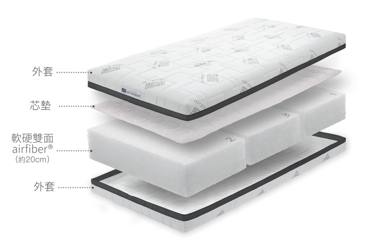 每個人的睡姿、體重、受壓位置都不盡相同。airweave獨家研發的內芯材料airfiber®能有效地幫助支撐身體,而且分為頭-腰-腳三部份,正反面均有軟,標準,硬三種硬度可自行搭配,適度地支持不同體型的需求。在仰睡或側睡都能保持脊椎有良好睡姿,達到優質睡眠品質。(雙人以上尺寸提供2套3塊芯材共六塊芯材,可分別組合個人需求。)